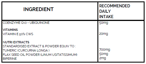 Ingredients: Ubiquinone, VIT E, Turmeric, Flaxseed, Bioperine