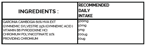 Ingredients: Garcinia Cambogia, Gymnemic Acid, VITB6, Chromium Polynicotinate