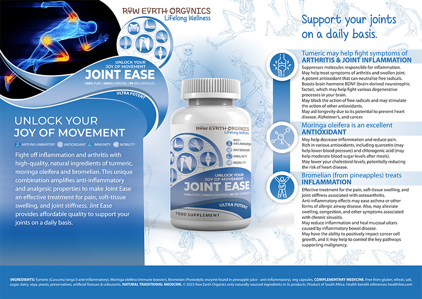 Fight off inflammation and arthritis with high quality, natural ingredients of turmeric, moringa oleifera and bromelian. This unique combination amplifies anti-inflammatory and analgesic properties to make Joint Ease an effective treatment for pain, soft tissue swelling, and joint stiffness. Joint Ease provides affordable quality to support your joints on a daily basis.