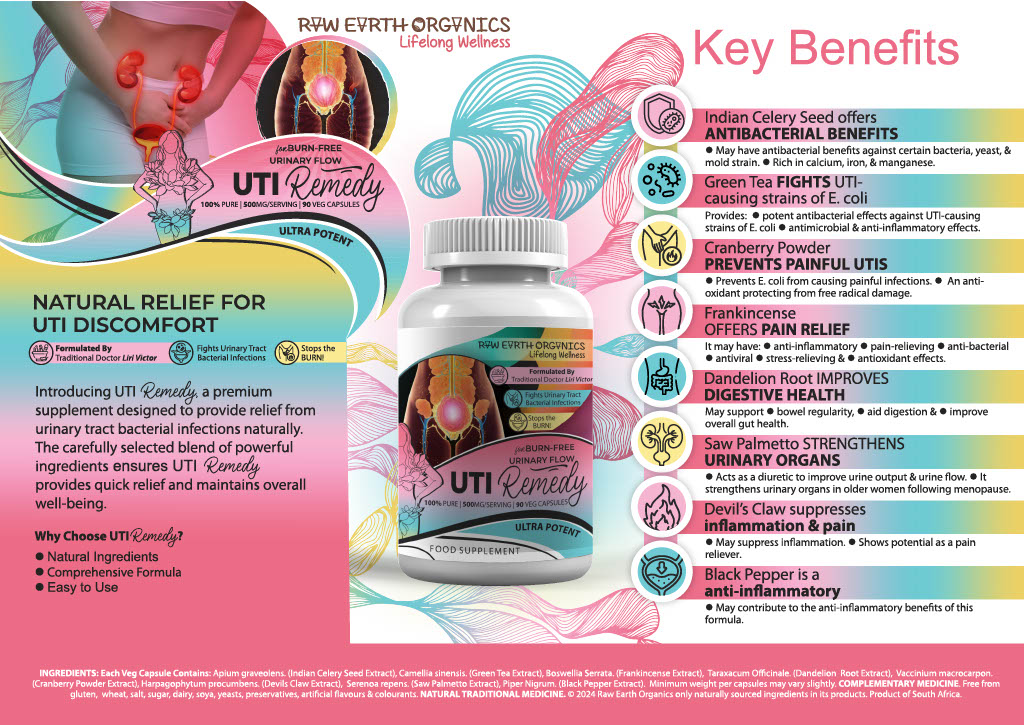 Experience soothing relief from UTI discomfort with our premium natural supplement. Formulated with a potent blend of herbs and minerals, our UTI Remedy targets the root cause of the infection, providing antibacterial benefits and reducing inflammation.