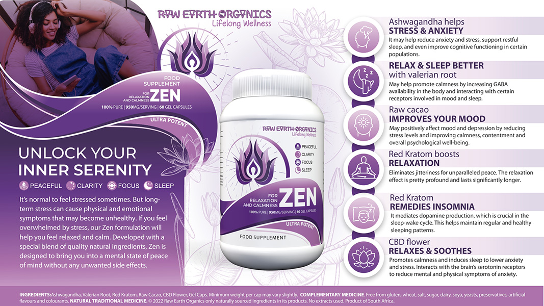 Developed with a special blend of quality natural ingredients, Zen is designed to bring you into a mental state of peace of mind being free from agitation, excitement, or disturbance without any unwanted side effects.