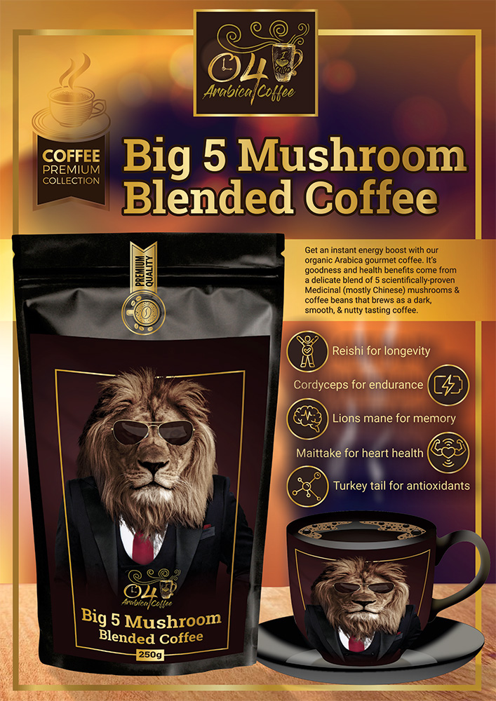 Big 5 Mushroom Blend coffee is a delicate blend of finely ground Medicinal (mostly Chinese) mushrooms and coffee beans that brews as a dark, smooth & nutty tasting coffee.