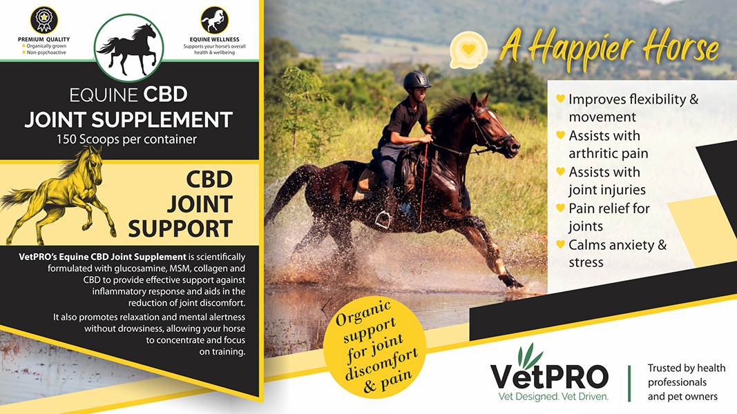 VetPro’s Equine CBD Joint Supplement is scientifically formulated with glucosamine, MSM, collagen and CBD to provide effective support against inflammatory response and aids in the reduction of joint discomfort. It also promotes relaxation and mental alertness without drowsiness, allowing your horse to concentrate and focus on training.