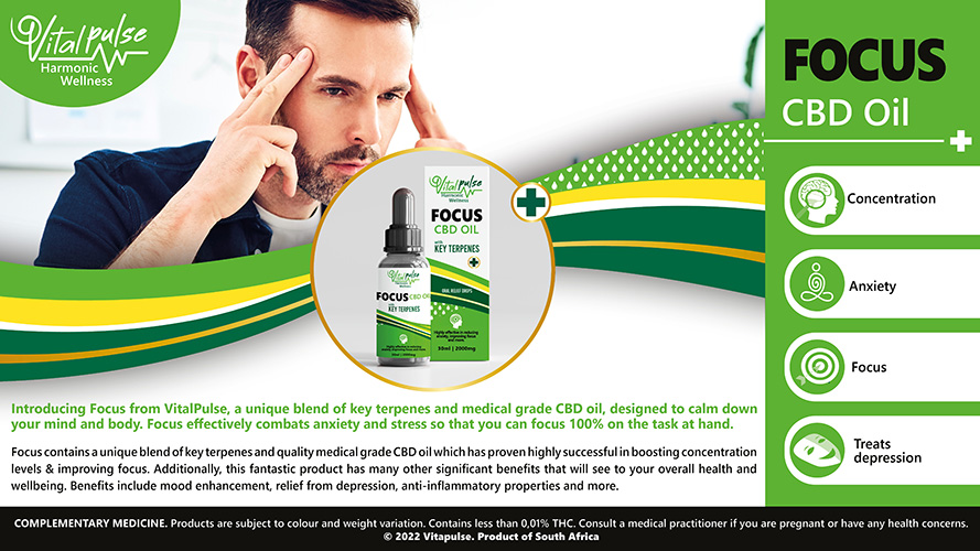 Introducing Focus from VitalPulse, a unique blend of key terpenes and medical grade CBD oil, designed to calm down your mind and body. Focus actively combats anxiety and stress so that you can focus 100% on the task at hand.