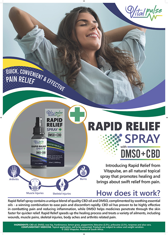 Introducing Rapid Relief from Vitapulse, an all natural topical spray that promotes healing and brings about swift relief from pain.